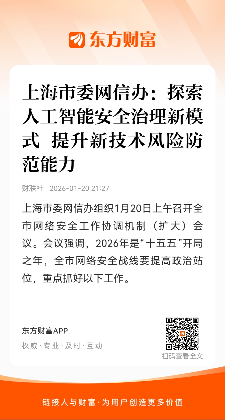 上海市委网信办组织1月20日上午召开全市网络安全工作协调机制(扩大)会议。会议强调,2026年是“十五五”开局之年,全市网络安全战线要提高政治站位,重点抓好以下工作:一是加强统筹协调,全面用好网络安全协调机制。二是强化关键信息基础设施安全保护,筑牢网络安全“防火墙”。三是加强数据全生命周期安全管理,护航数字经济发展。四是探索人工智能安全治理新模式,提升新技术风险防范能力。五是健全网络安全应急响应体系,提升实战化攻防对抗水平。