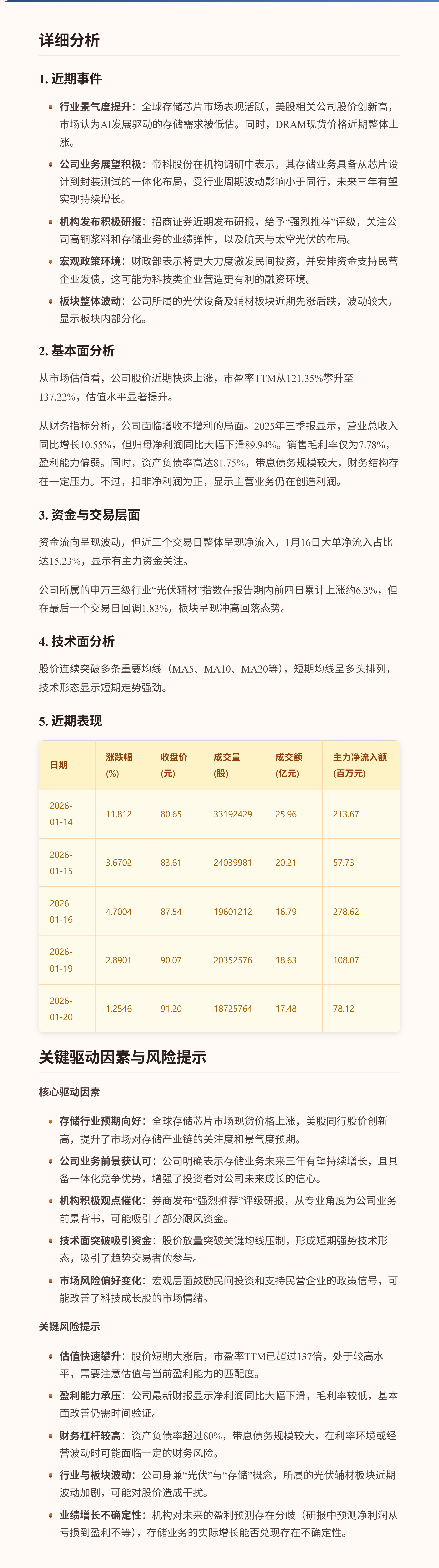 $帝科股份(SZ300842)$ 帝科股份近期股价连续上涨,主要受到存储芯片行业景气度回升及公司自身业务前景获机构看好的双重驱动。全球存储芯片股表现强劲,叠加公司表示其存储业务有望实现持续增长,吸引了市场关注。关键亮点在于公司股价在五个交易日内累计涨幅超过26%,且交易活跃度显著提升。