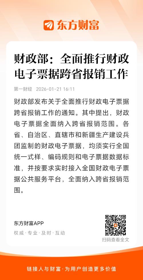 财政部发布关于全面推行财政电子票据跨省报销工作的通知。其中提出,财政电子票据全面纳入跨省报销范围。各省、自治区、直辖市和新疆生产建设兵团监制的财政电子票据,均须实行全国统一式样、编码规则和电子票据数据标准,并按要求实时接入全国财政电子票据公共服务平台,全面纳入跨省报销范围。