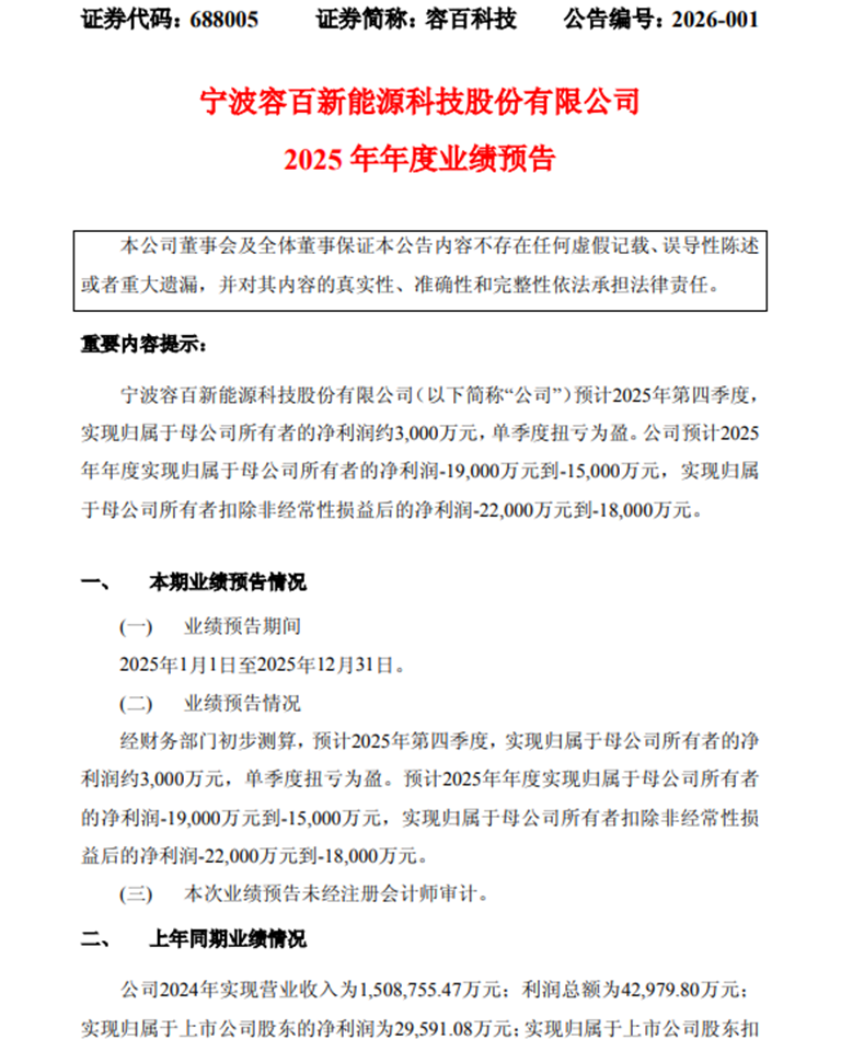 1月13日,公司发布2025年年度业绩预告,预计2025年全年实现归属于母公司所有者的净利润为-1.9亿元至-1.5亿元,扣除非经常性损益后的净利润为-2.2亿元至-1.8亿元。