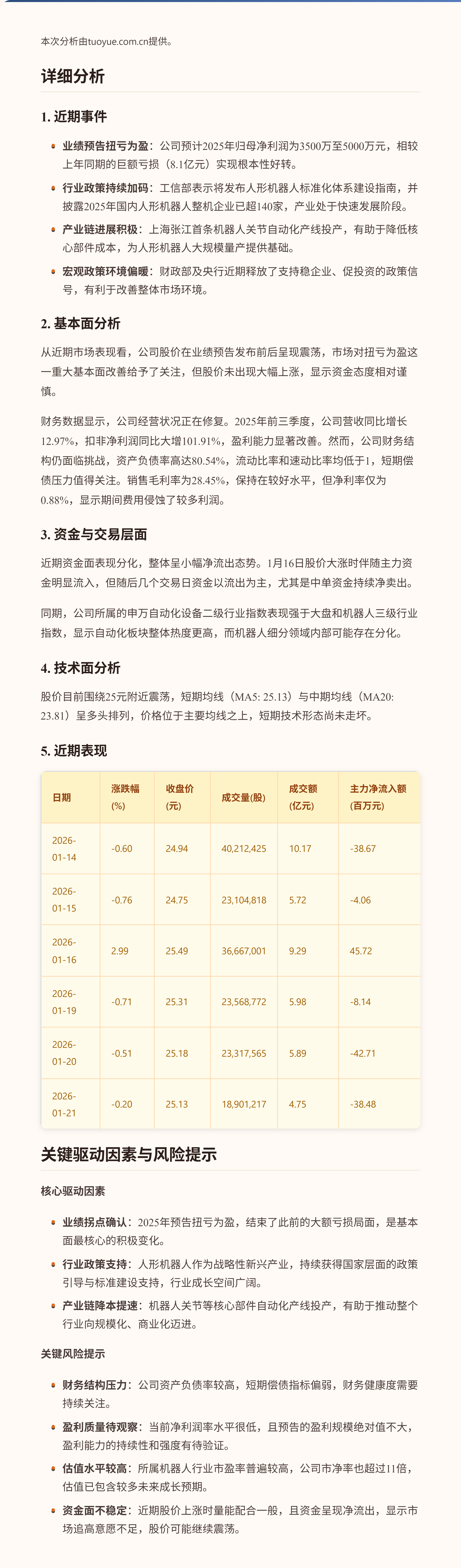 埃斯顿近期股价在窄幅震荡中略有下行。公司发布2025年业绩预告,预计实现扭亏为盈