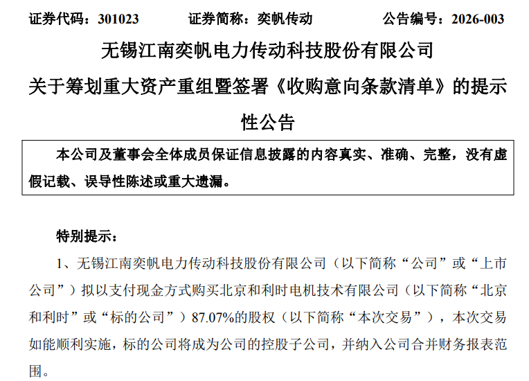 消息面上,奕帆传动1月20日晚间公告称,公司拟以支付现金方式购买北京和利时电机技术有限公司87.07%的股权,本次交易预计构成重大资产重组。交易完成后,标的公司将成为公司的控股子公司,并纳入公司合并财务报表范围。