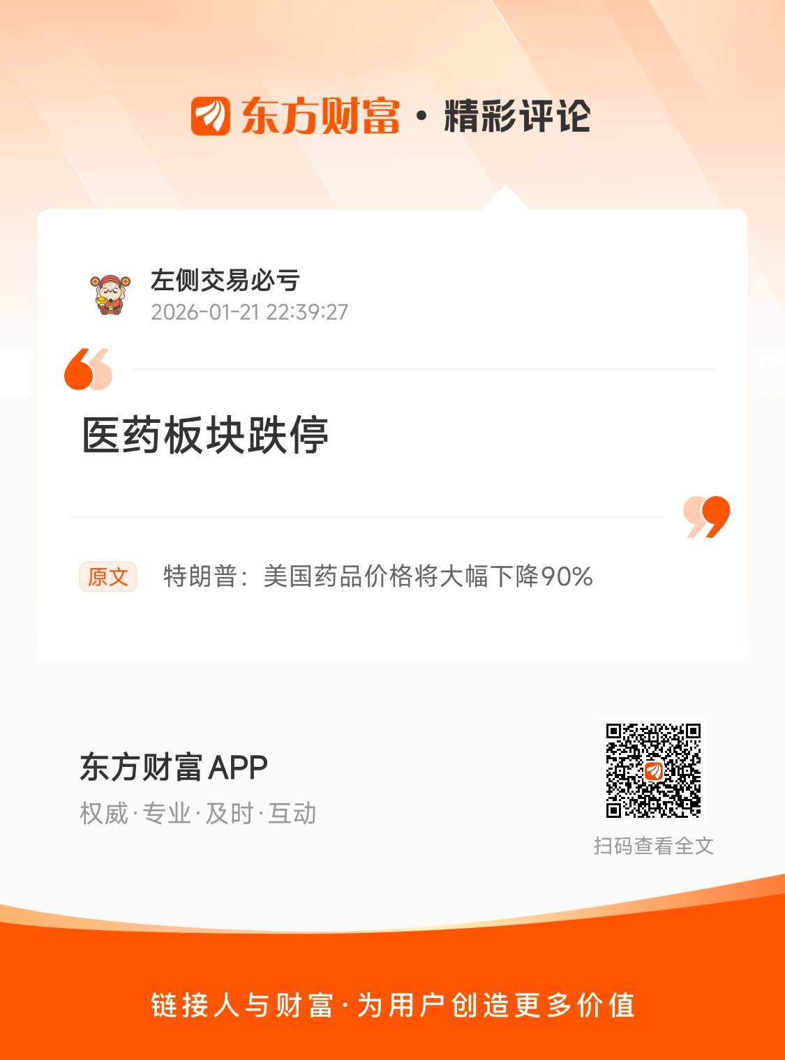医药板块跌停 我在《特朗普:美国药品价格将大幅下降90%》的评论获得了大家的关注。