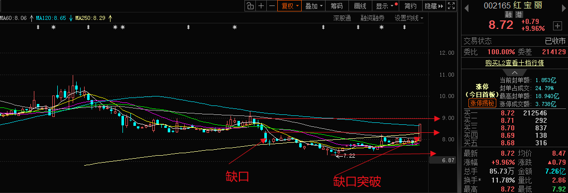 $红宝丽(SZ002165)$曾经的化工真龙归来,化工板块整体走强带动,主力净流入3个亿,形态上突破前期8.3缺口压力后,今日首板,符合一进二的预期,今日若小幅高开2%会小仓试错,反之下探8.5主力成本内震荡,行情结束,一日行情罢了。