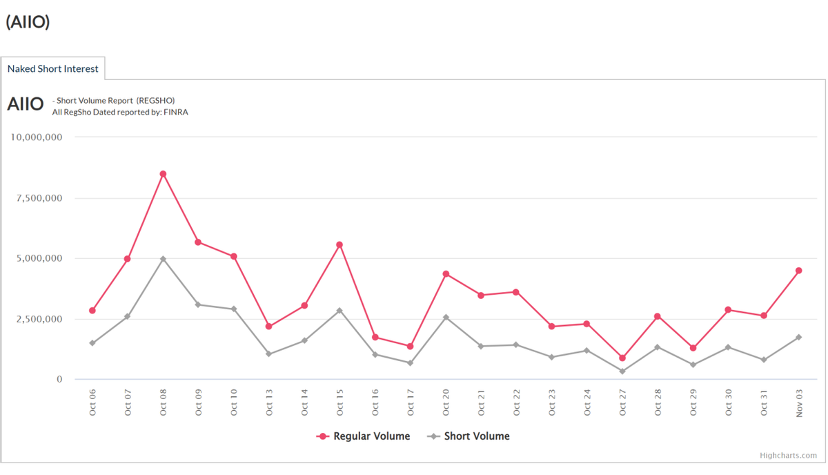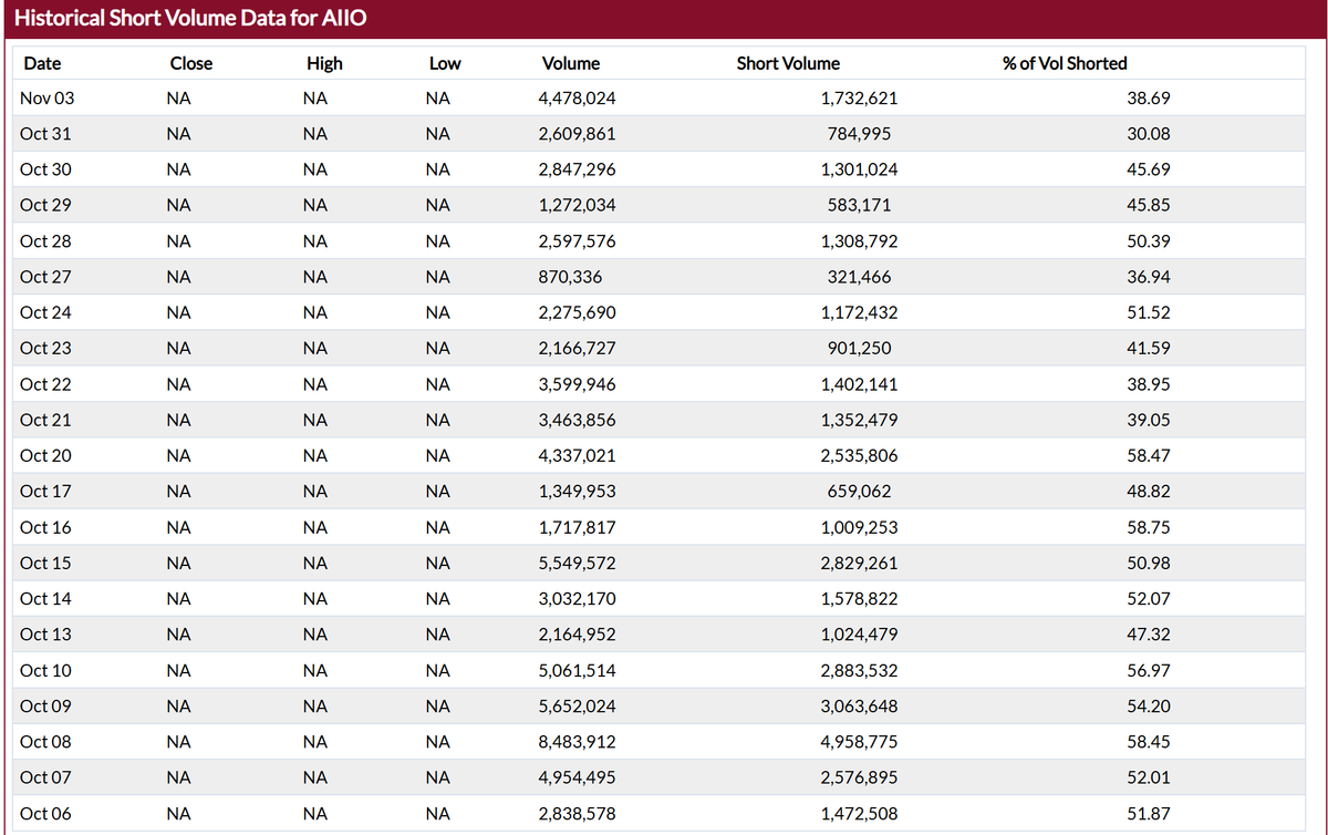 • 卖空成交占比异常偏高:FINRA场外交易报告显示,10月下旬多个交易日AIIO的空头成交量占比远超常态。例如,10月24日报告的场外卖空量占当日总成交的51.52%;10月26日这一占比也高达58.75%。日交易量中超过一半来自卖空在市场中极为罕见,意味着当时每两股成交中就有一股通过融券卖出,卖空盘对股价形成了持续下压。从成交量上分析,甚至不排除有部分机构恶意裸空。