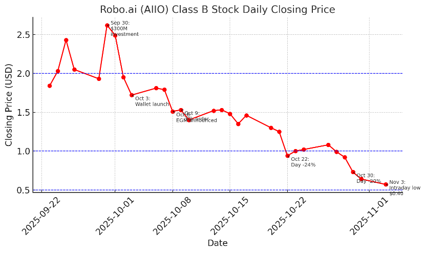 • 11月初: 截至11月3日,AIIO已连续第五个交易日收跌。11月3日盘中一度探底至$0.403,较一个月前高点(约$2)跌去约80%,当日振幅高达59%,最终收于$0.574。