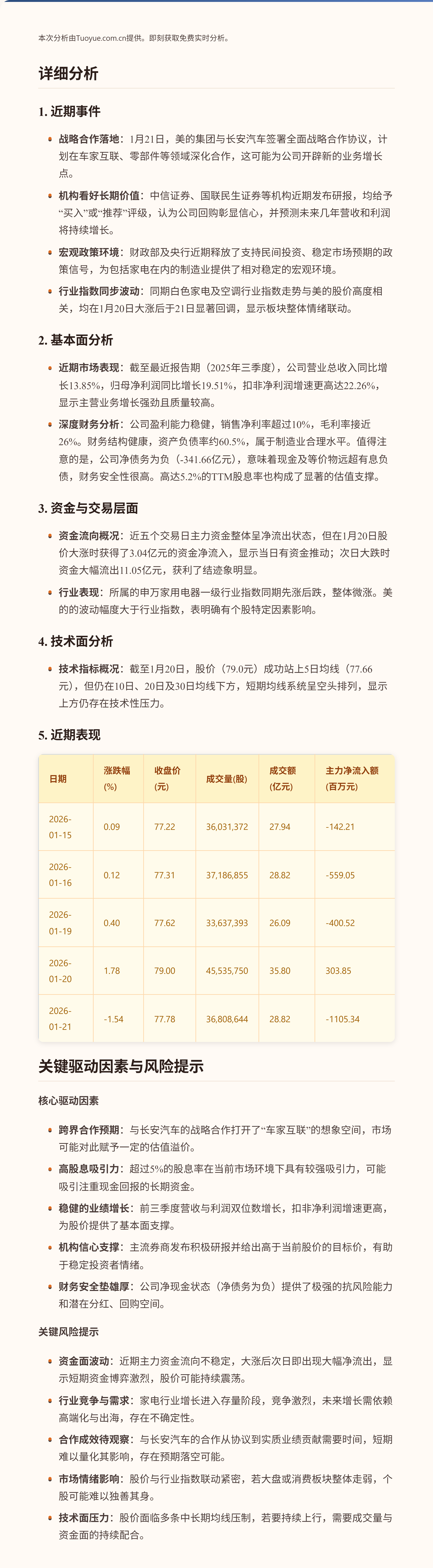 $美的集团(SZ000333)$ 美的集团股价在最近五个交易日呈现震荡上行后回调的态势,1月20日单日上涨1.78%是主要亮点,但次日随即回调1.54%。股价波动主要受到与长安汽车签署战略合作等事件性驱动,以及整体市场资金流向变化的影响。关键亮点在于公司股息率(TTM)超过5%,显示出较高的股东回报吸引力,同时机构对其长期前景维持积极看法。