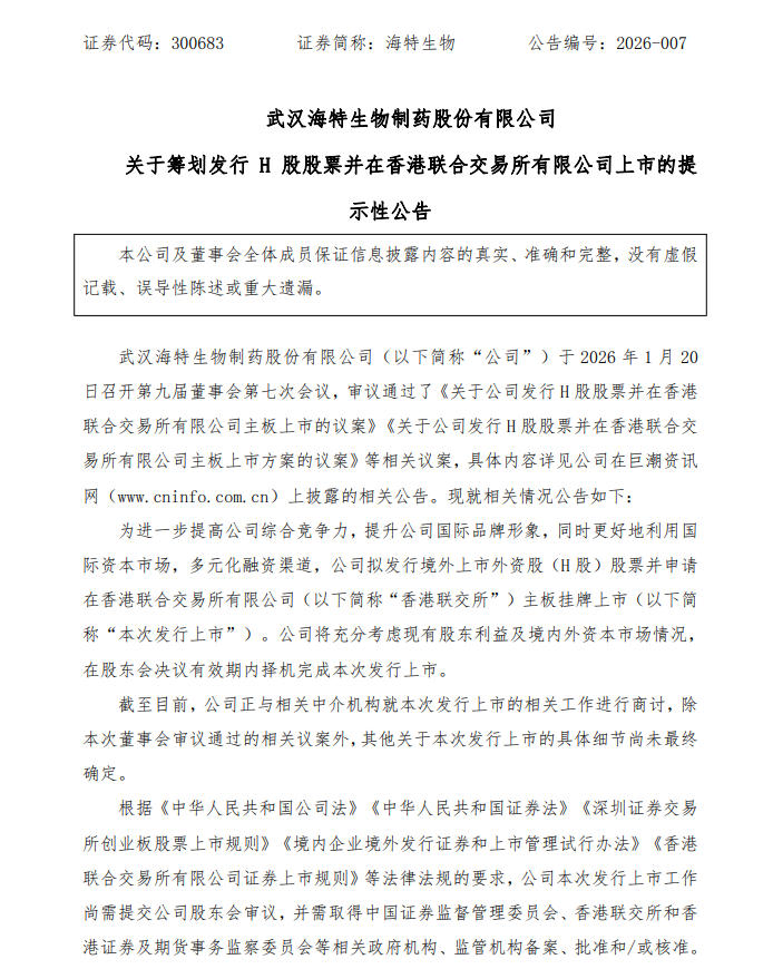 【海特生物筹划发行H股股票并在香港联交所上市】1月20日晚间,海特生物发布公告称