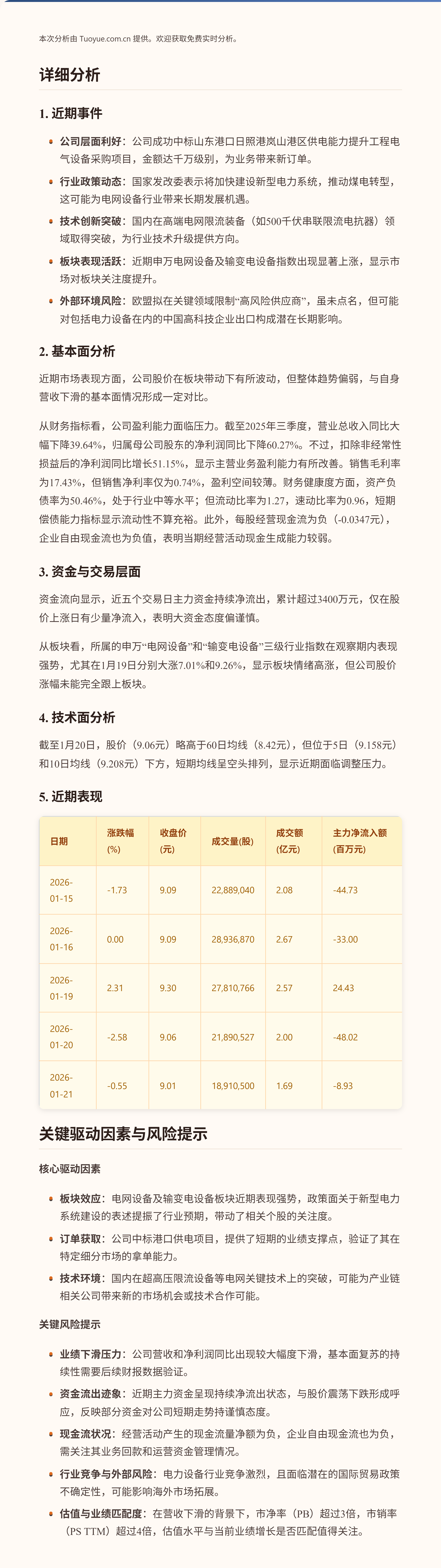 $昇辉科技(SZ300423)$ 昇辉科技近期股价在9元附近震荡,五个交易日累计下跌约2.6%。股价波动主要受到所属电网设备板块整体活跃度提升的带动,以及公司自身中标港口项目等消息影响。关键点在于,公司股价表现与板块指数高度联动,但资金面呈现持续净流出状态,且基本面数据显示营收与利润同比下滑。