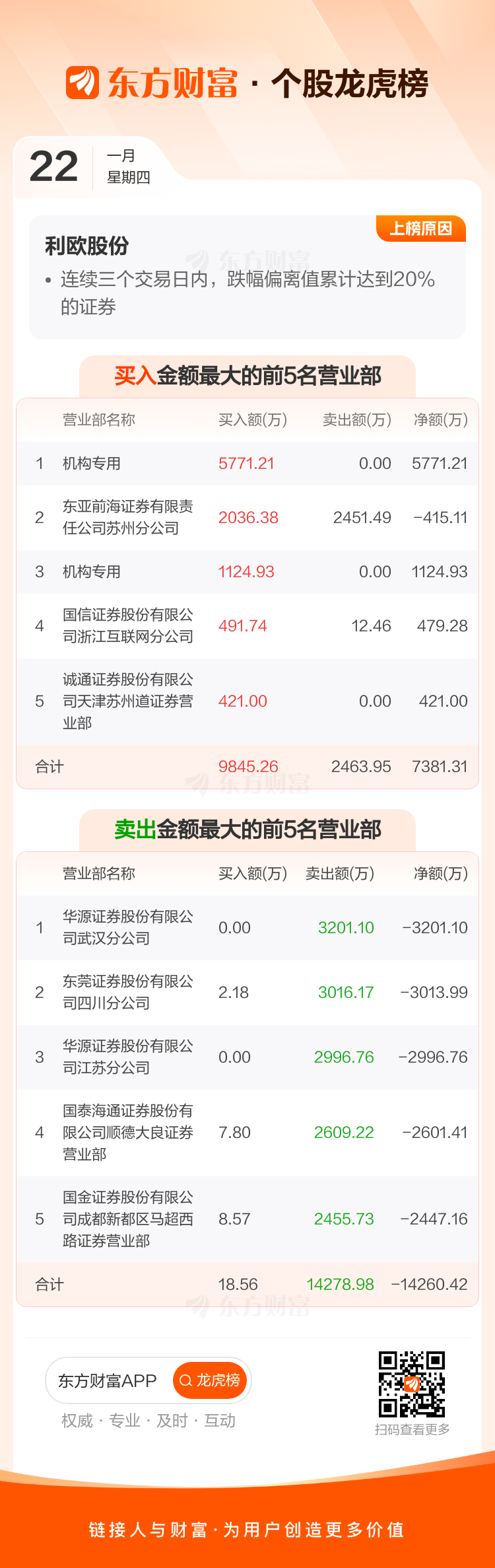 交易所2026年1月22日公布的交易公开信息显示,利欧股份因成为日跌幅偏离值达到7%的前5只证券、连续三个交易日内,跌幅偏离值累计达到20%的证券上榜。利欧股份当日收报8.42元,涨跌幅-10.04%,偏离值-10.69%,换手率0.59%,成交额2.89亿。异常期间1月21日至1月22日,期间涨幅-19.04%,累计偏离值-20.37%,区间成交额6.50亿。