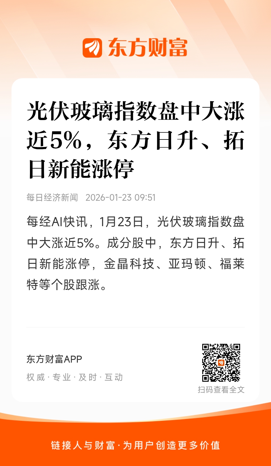 每经AI快讯,1月23日,光伏玻璃指数盘中大涨近5%。成分股中,东方日升、拓日新能涨停,金晶科技、亚玛顿、福莱特等个股跟涨。