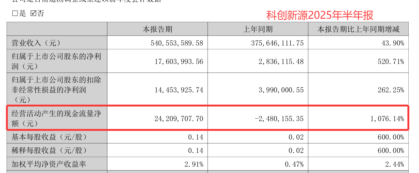 海外通信业务的稳健增长也为业绩做出了重要贡献。在通信领域,科创新源与华为、中兴等国内外主要通信设备厂商保持着长期稳定的合作关系。随着 5G 通信技术的普及和海外市场的拓展,公司海外通信业务收入规模不断扩大,利润率也稳步提升,有效带动了公司整体业绩的增长 。在业绩增长的同时,科创新源的现金流状况也得到了显著改善,2025 年上半年,公司经营活动产生的现金流量净额同比增长 1076.14%,达到 2421 万元,当期净现比超过 1,这意味着公司的利润具有较高的 “含金量”,资金回笼速度加快,为公司的后续发展提供了坚实的资金保障。