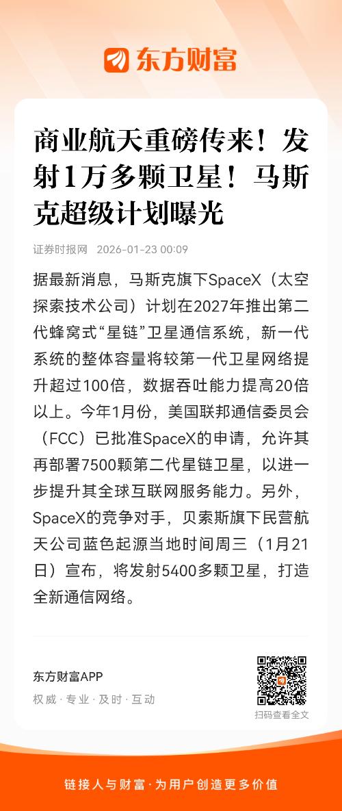 另外,SpaceX的竞争对手,贝索斯旗下民营航天公司蓝色起源当地时间周三(1月21日)宣布,将发射5400多颗卫星,打造全新通信网络。