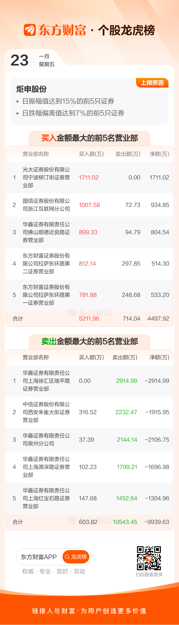 交易所2026年1月23日公布的交易公开信息显示,炬申股份因成为日振幅值达到15%的前5只证券、日跌幅偏离值达到7%的前5只证券上榜。炬申股份当日收报20.3元,涨跌幅-8.60%,偏离值21.96%,换手率30.87%,成交额7.47亿。