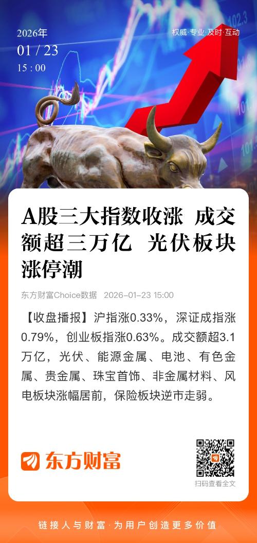 A股三大指数今日集体收涨,沪指涨0.33%,收报4136.16点;深证成指涨0.79%,收报14439.66点;创业板指涨0.63%,收报3349.50点。沪深京三市成交额达到31184亿,较昨日放量4017亿。