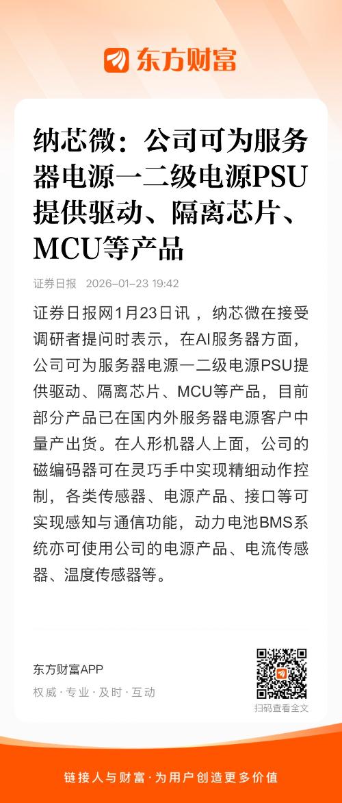 证券日报网1月23日讯 ,纳芯微在接受调研者提问时表示,在AI服务器方面,公司可为服务器电源一二级电源PSU提供驱动、隔离芯片、MCU等产品,目前部分产品已在国内外服务器电源客户中量产出货。在人形机器人上面,公司的磁编码器可在灵巧手中实现精细动作控制,各类传感器、电源产品、接口等可实现感知与通信功能,动力电池BMS系统亦可使用公司的电源产品、电流传感器、温度传感器等。