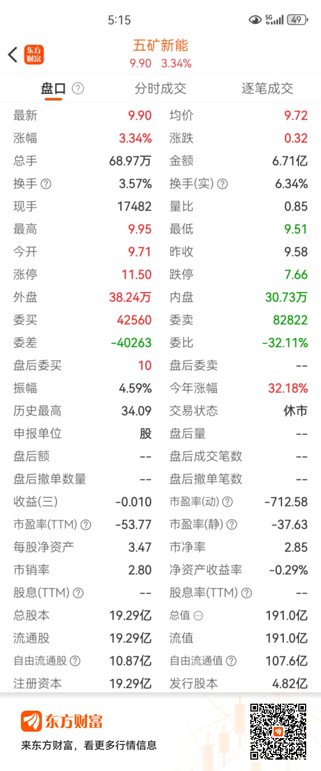 五矿新能!交易日截止到2026年1月23日基本信息显示市盈率(动)-712.58