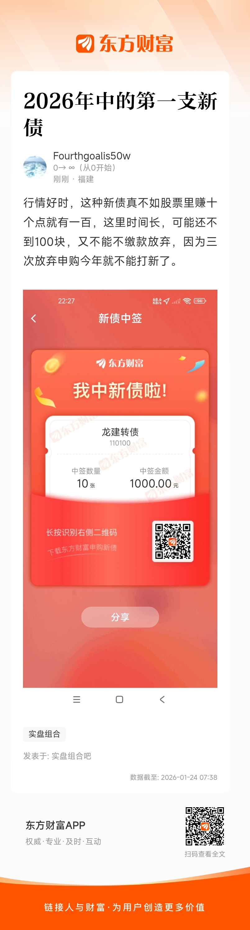 行情好时,这种新债真不如股票里赚十个点就有一百,这里时间长,可能还不到100块,又不能不缴款放弃,因为三次放弃申购今年就不能打新了。