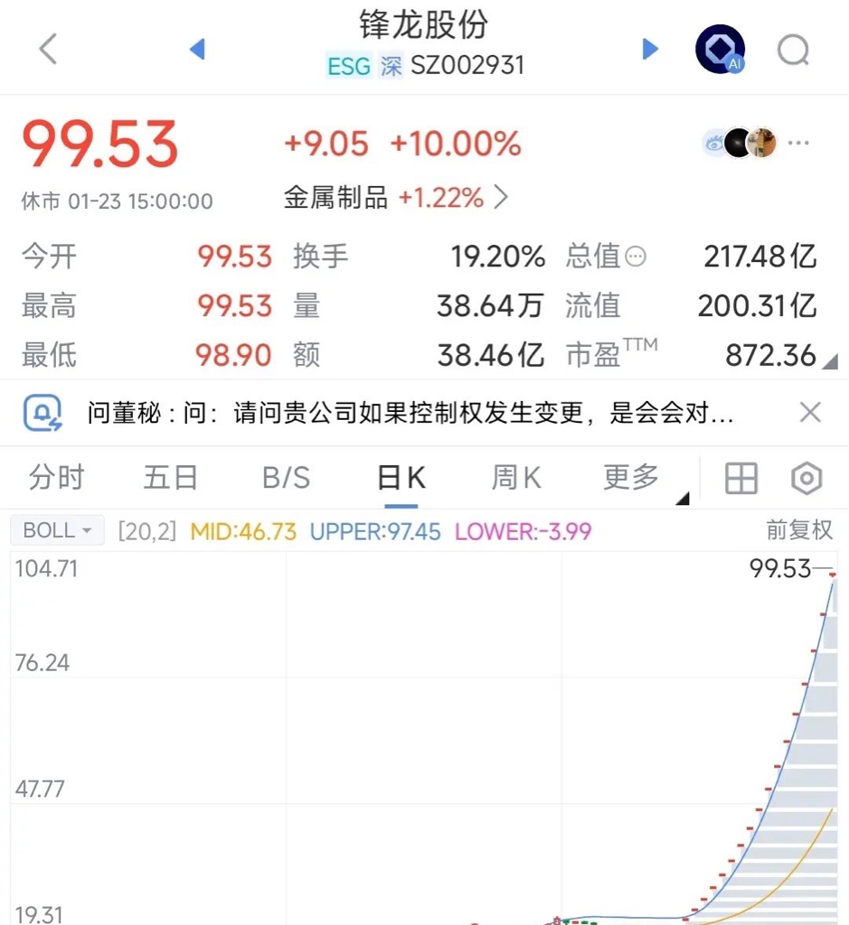 昨晚深交所发了对锋龙股份的监管报告,可以说就是为了给锋龙股份降温,毕竟现在的炒作已经严重的脱离了其基本面,而且市盈率已经达到了恐怖872.36,这连纯正的科技股也达不到的市盈率。