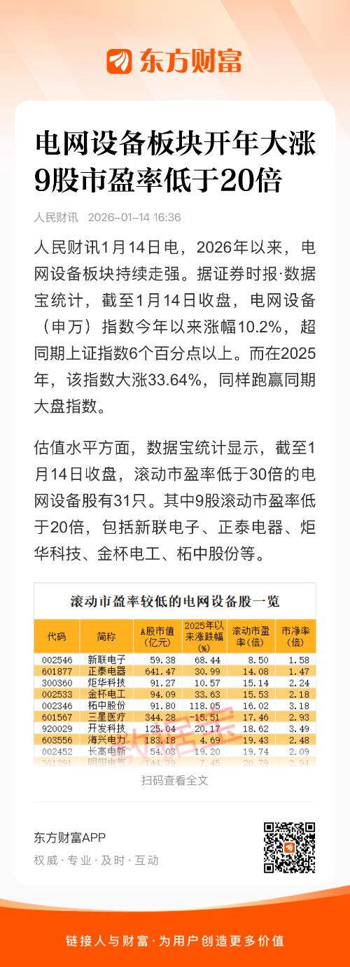估值水平方面,数据宝统计显示,截至1月14日收盘,滚动市盈率低于30倍的电网设备股有31只。其中9股滚动市盈率低于20倍,包括新联电子、正泰电器、炬华科技、金杯电工、柘中股份等。