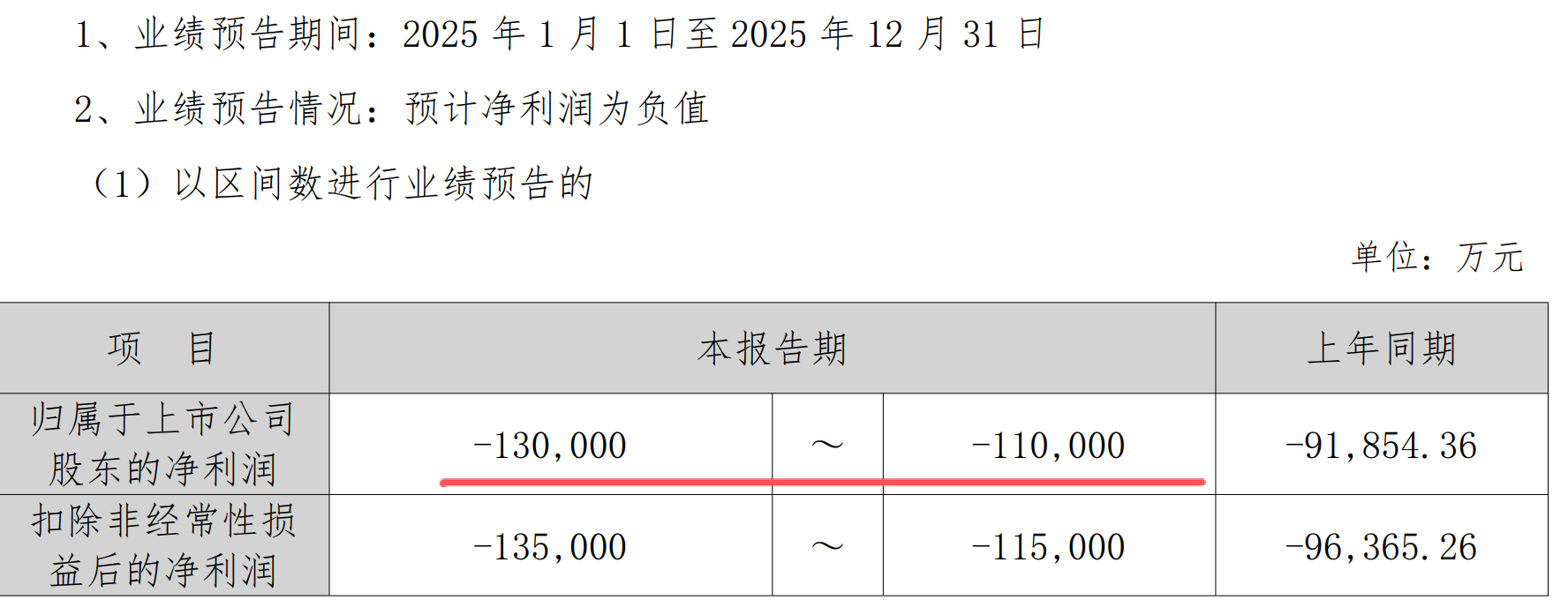 亚光科技,2025年亏损11亿到13亿元。亚光科技出现 12 亿元的大幅亏损,主要源于多重行业与公司自身因素的叠加。一方面,船舶制造行业面临周期下行压力,下游需求疲软叠加原材料价格波动,导致公司相关业务营收下滑、毛利率承压;另一方面,公司在军工电子等领域的研发投入持续加大,同时部分资产减值、商誉减值以及应收账款计提坏账准备等会计处理,也进一步扩大了亏损规模。此外,全球供应链波动和汇率变动等外部因素,也对公司的海外业务和成本控制造成了一定冲击。