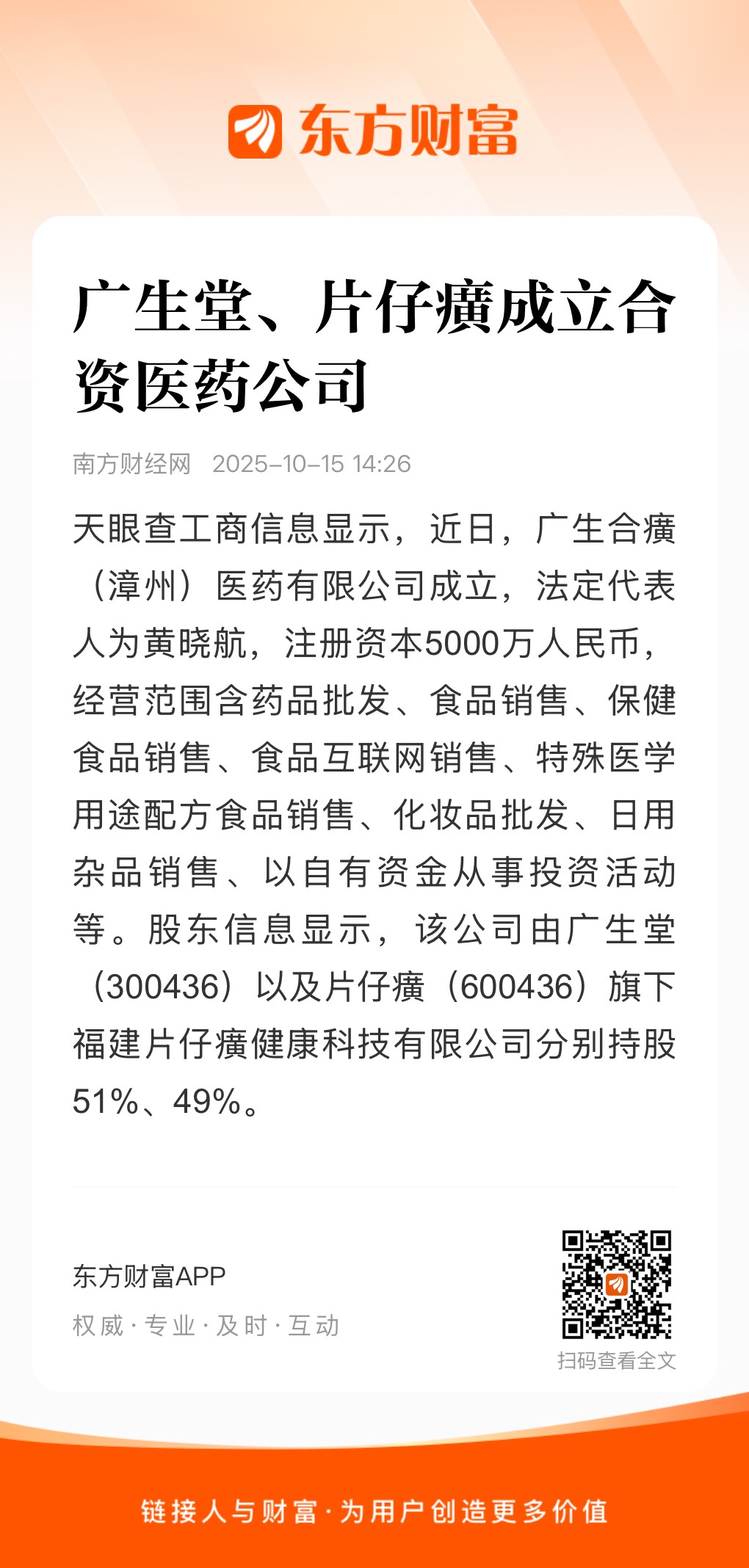 南方财经10月15日电,天眼查工商信息显示,近日,广生合癀(漳州)医药有限公司成立,法定代表人为黄晓航,注册资本5000万人民币,经营范围含药品批发、食品销售、保健食品销售、食品互联网销售、特殊医学用途配方食品销售、化妆品批发、日用杂品销售、以自有资金从事投资活动等。股东信息显示,该公司由广生堂(300436)以及片仔癀(600436)旗下福建片仔癀健康科技有限公司分别持股51%、49%。