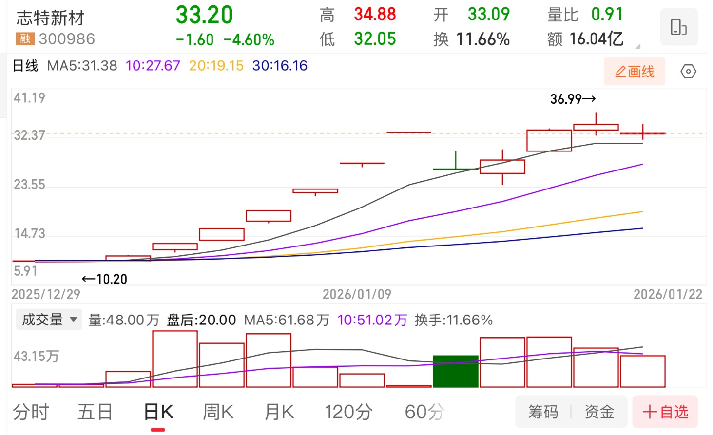 1月22日,志特新材股价应声下跌。截至当天收盘,股价报收33.2元,收跌4.6%,市值为136.66亿元。