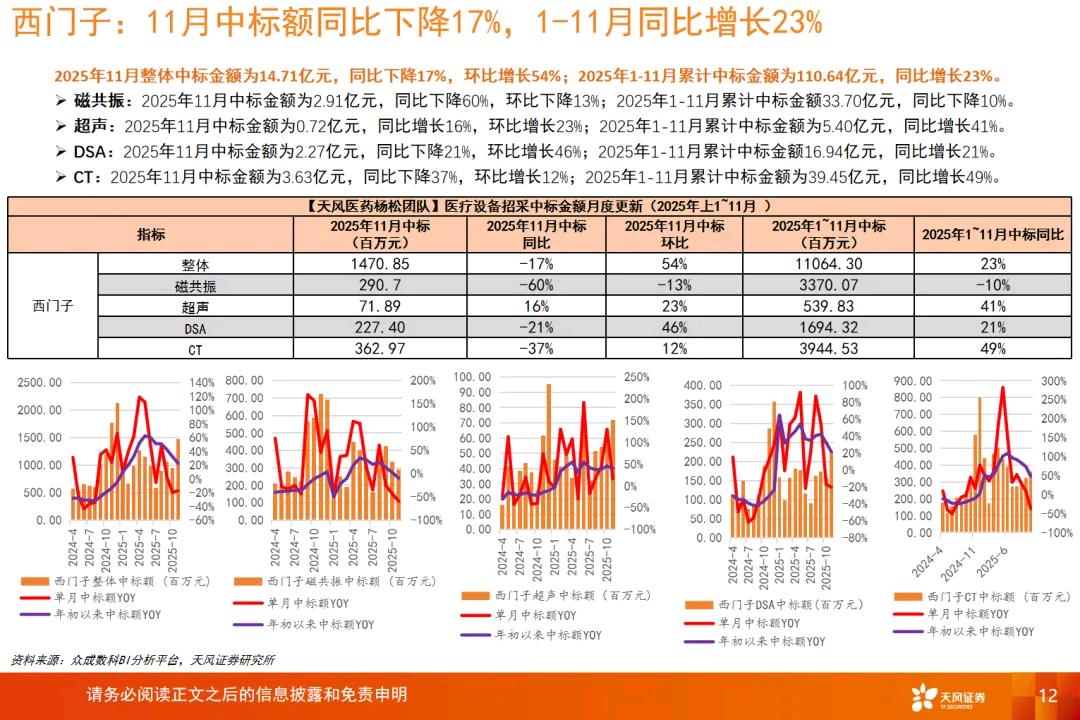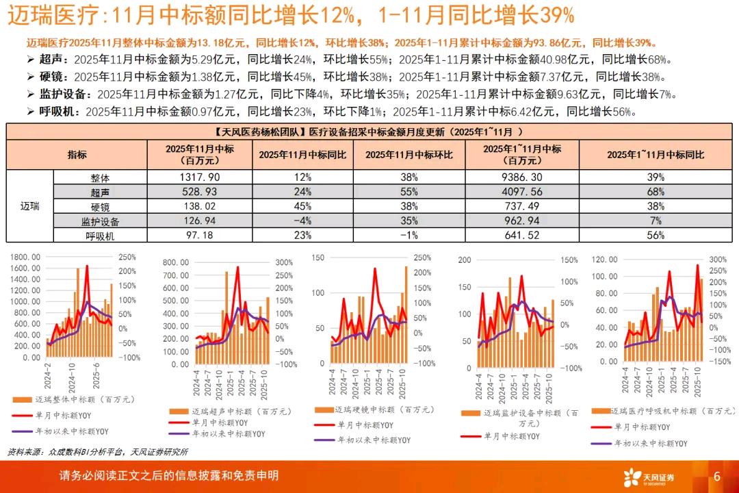 迈瑞医疗2025年11月整体中标金额为13.18亿元,同比增长12%,环比增长38%;2025年1-11月累计中标金额为93.86亿元,同比增长39%。