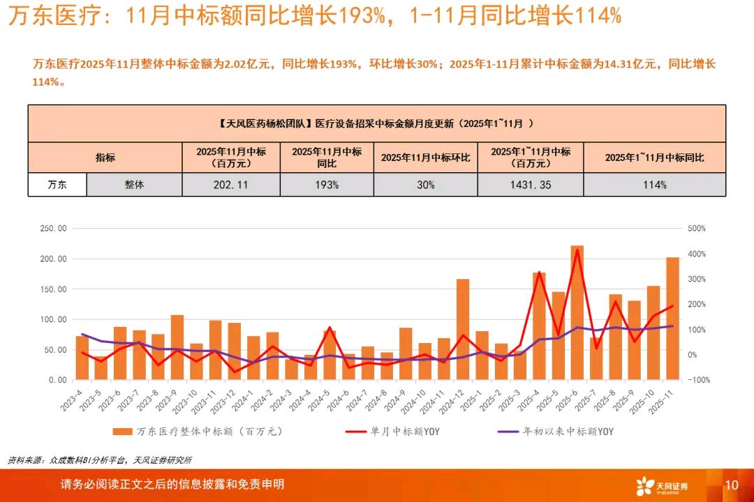 根据天风证券的研究报告,25年1-11月联影、迈瑞同比增长超35%,万东同比增长超100%;