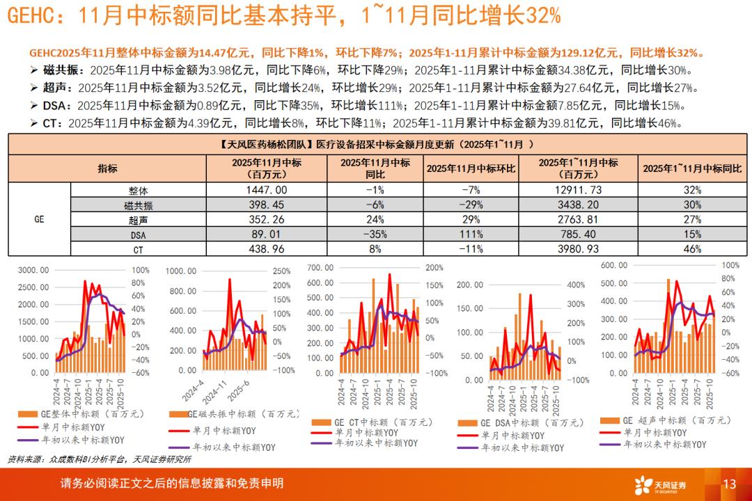 通用医疗:GEHC2025年11月整体中标金额为14.47亿元,同比下降1%,环比下降7%;2025年1-11月累计中标金额为129.12亿元,同比增长32%。