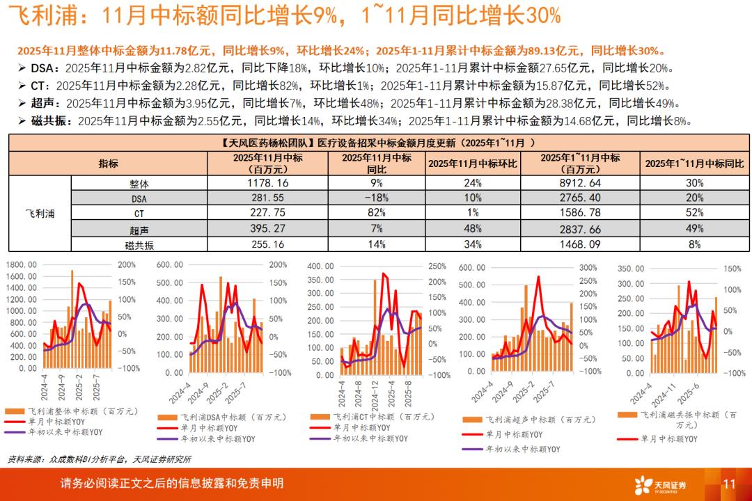 飞利浦:2025年11月整体中标金额为11.78亿元,同比增长9%,环比增长24%;2025年1-11月累计中标金额为89.13亿元,同比增长30%。