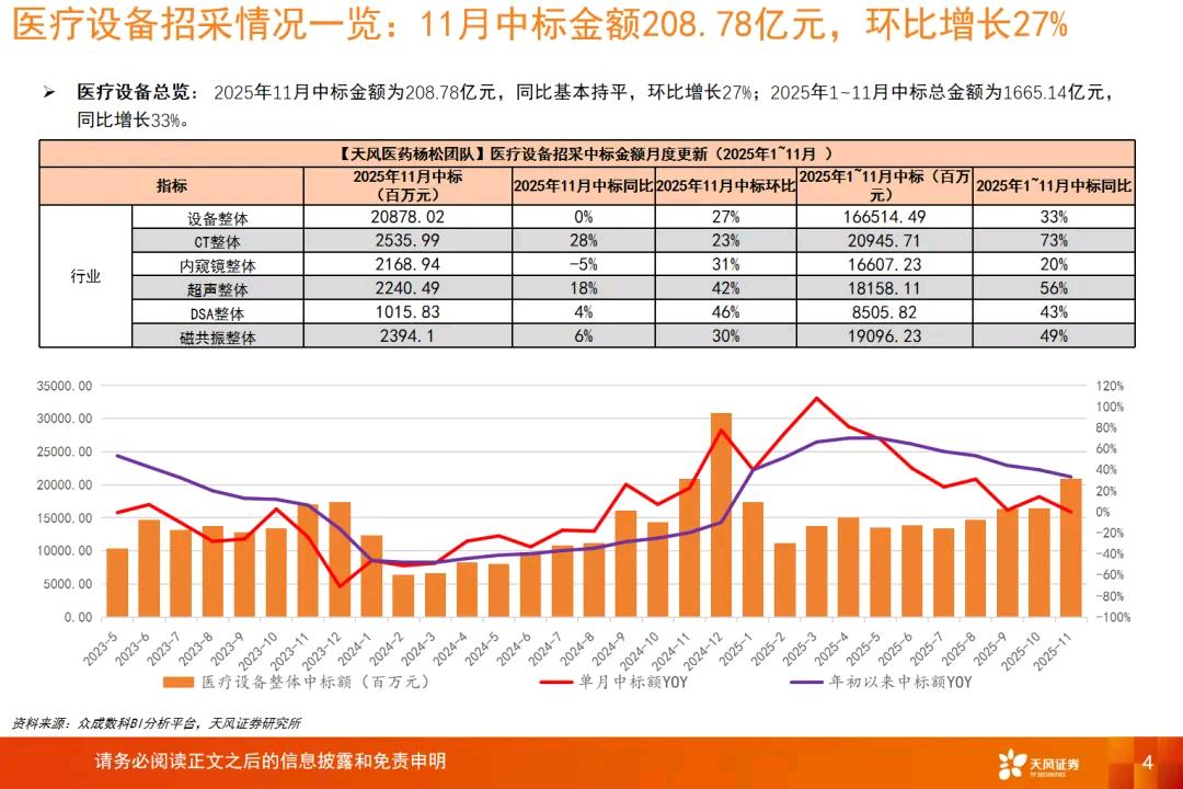 2025年12月份,天风证券发布研究报告,25年1-11月,医疗器械中标总额1665.14亿元,同比24年增长33%,较2023年亦有一定的增长。