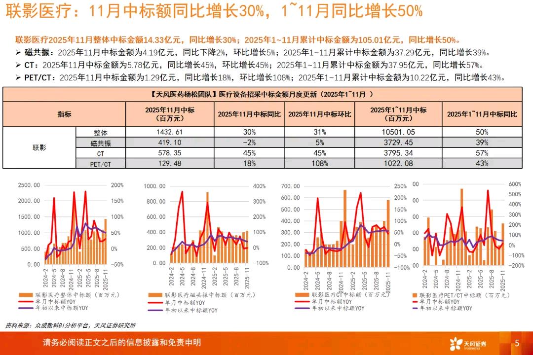联影医疗2025年11月整体中标金额14.33亿元,同比增长30%;2025年1~11月累计中标金额为105.01亿元,同比增长50%。