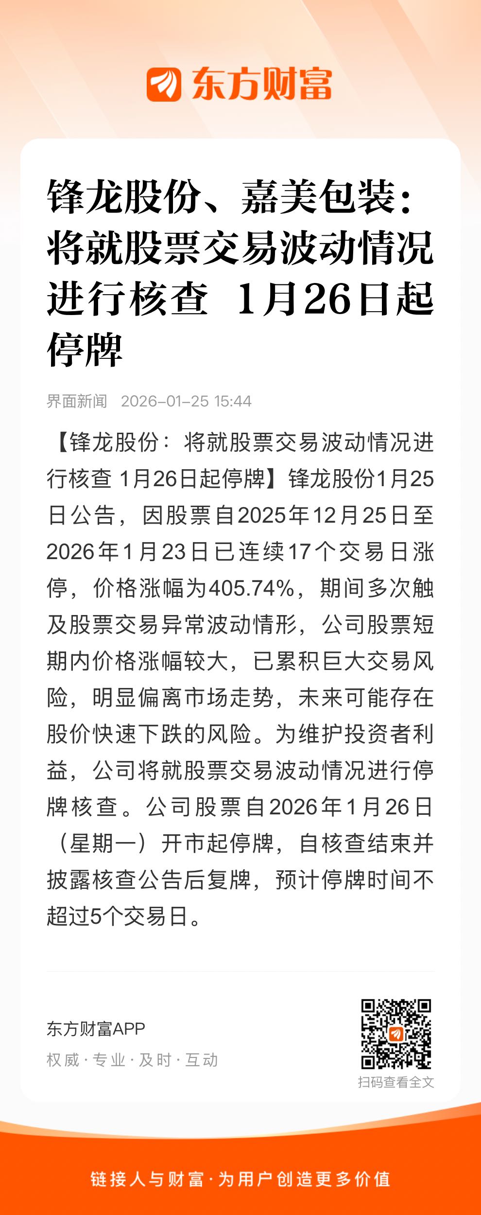 嘉美包装1月25日公告,公司股票自2025年12月17日至2026年1月23日期间价格涨幅为408.11%,期间多次触及股票交易异常波动情形,公司股票短期内价格涨幅较大,已背离公司基本面,为维护投资者利益,公司将就股票交易波动情况进行停牌核查。公司股票自2026年1月26日(星期一)开市起停牌,预计停牌时间不超过5个交易日。