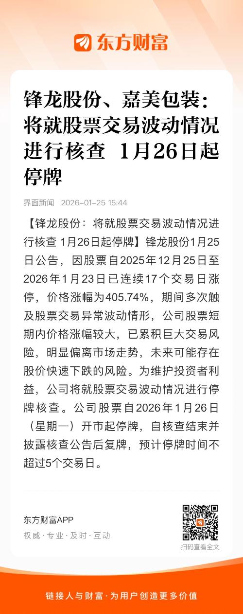 锋龙股份1月25日公告,因股票自2025年12月25日至2026年1月23日已连续17个交易日涨停,价格涨幅为405.74%,期间多次触及股票交易异常波动情形,公司股票短期内价格涨幅较大,已累积巨大交易风险,明显偏离市场走势,未来可能存在股价快速下跌的风险。为维护投资者利益,公司将就股票交易波动情况进行停牌核查。公司股票自2026年1月26日(星期一)开市起停牌,自核查结束并披露核查公告后复牌,预计停牌时间不超过5个交易日。