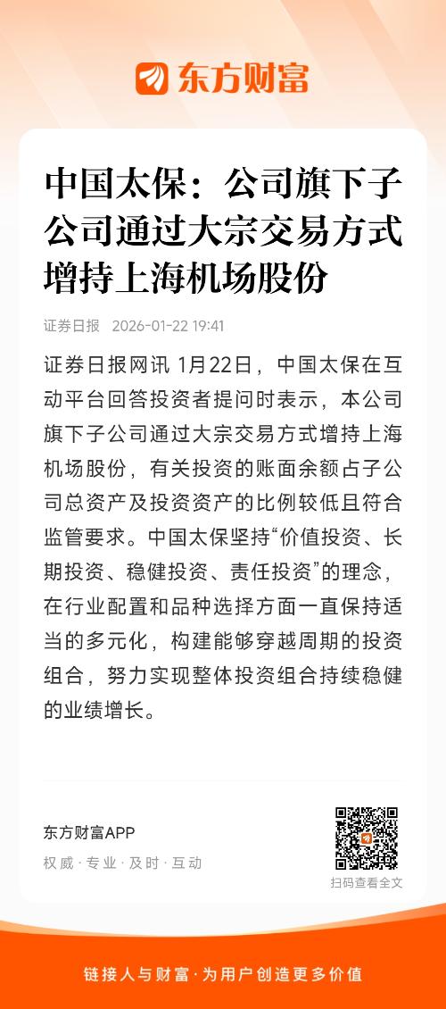 证券日报网讯 1月22日,中国太保在互动平台回答投资者提问时表示,本公司旗下子公司通过大宗交易方式增持上海机场股份,有关投资的账面余额占子公司总资产及投资资产的比例较低且符合监管要求。中国太保坚持“价值投资、长期投资、稳健投资、责任投资”的理念,在行业配置和品种选择方面一直保持适当的多元化,构建能够穿越周期的投资组合,努力实现整体投资组合持续稳健的业绩增长。