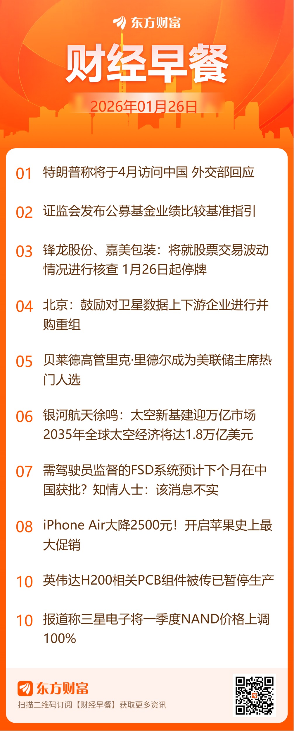 锋龙股份1月25日公告,因股票自2025年12月25日至2026年1月23日已连续17个交易日涨停,价格涨幅为405.74%,公司将就股票交易波动情况进行停牌核查。公司股票自2026年1月26日(星期一)开市起停牌,预计停牌时间不超过5个交易日。嘉美包装1月25日公告,公司股票自2025年12月17日至2026年1月23日期间价格涨幅为408.11%,公司股票自2026年1月26日(星期一)开市起停牌,预计停牌时间不超过5个交易日。