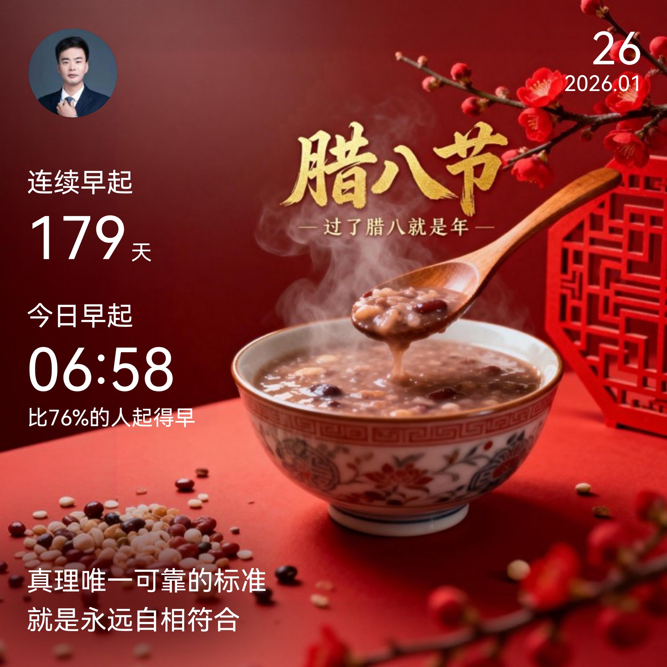 今天是026年1月26日星期一,农历腊月初八,五九,朋友们大家早上好!