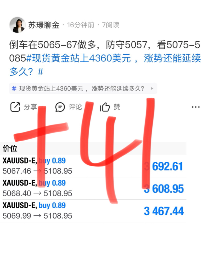 刚刚在5067附近布局的多单,现在行情给到5108,妥妥拿下41大点!脑子里想的