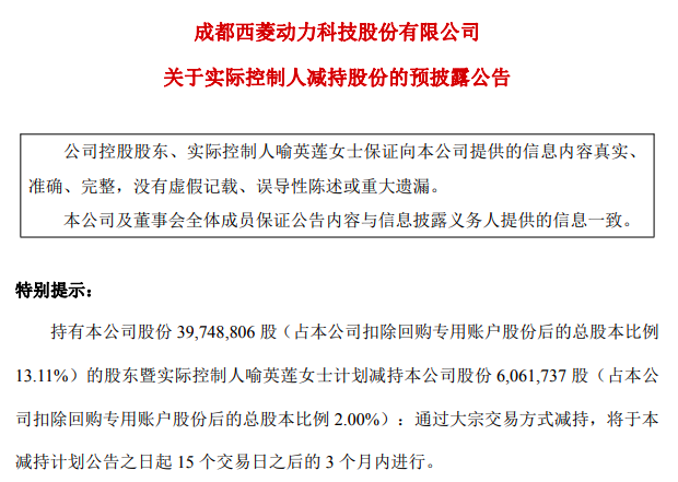 2025年12月25日晚,西菱动力披露关于实际控制人减持股份的预披露公告称,持有公司股份39,748,806 股(占本公司扣除回购专用账户股份后的总股本比例13.11%)的股东暨实际控制人喻英莲女士计划减持公司股份6,061,737 股(占本公司扣除回购专用账户股份后的总股本比例 2.00%)。其通过大宗交易方式减持,将于减持计划公告之日起15个交易日之后的3个月内进行。