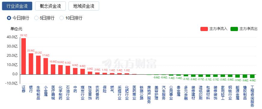 行业资金方面,截至收盘,证券、银行、生物制品等净流入排名靠前,其中证券净流入39.07亿。