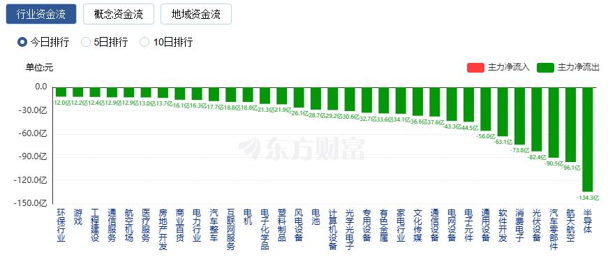 净流出方面,半导体、航天航空、汽车零部件等净流出排名靠前,其中半导体净流出134.3亿元。
