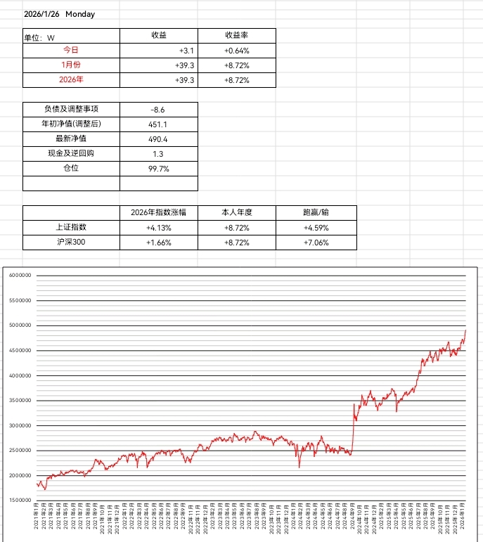 2026.1.26周一今日:+3.1w(+0.64%)2026年:+39.3w(