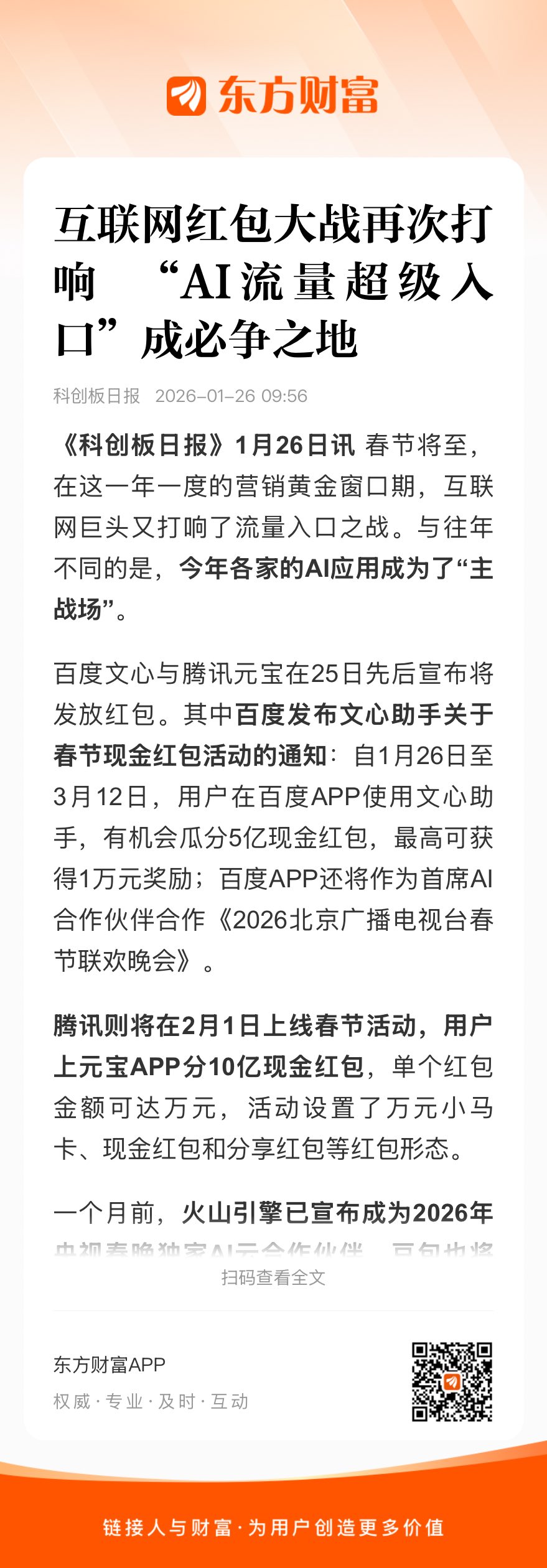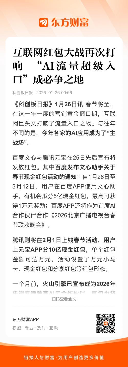 百度文心与腾讯元宝在25日先后宣布将发放红包。其中百度发布文心助手关于春节现金红包活动的通知:自1月26日至3月12日,用户在百度APP使用文心助手,有机会瓜分5亿现金红包,最高可获得1万元奖励;百度APP还将作为首席AI合作伙伴合作《2026北京广播电视台春节联欢晚会》。
