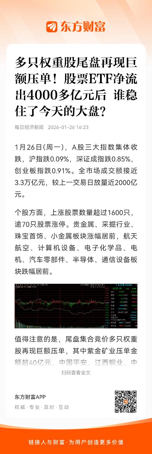 值得注意的是,尾盘集合竞价多只权重股再现巨额压单,其中紫金矿业压单金额超40亿元,中国平安、江西铜业、中国中免、山东黄金、万华化学、贵州茅台压单金额超4亿元。此前在2026年1月14日,招商银行、紫金矿业、长江电力等多股压单金额超10亿元。