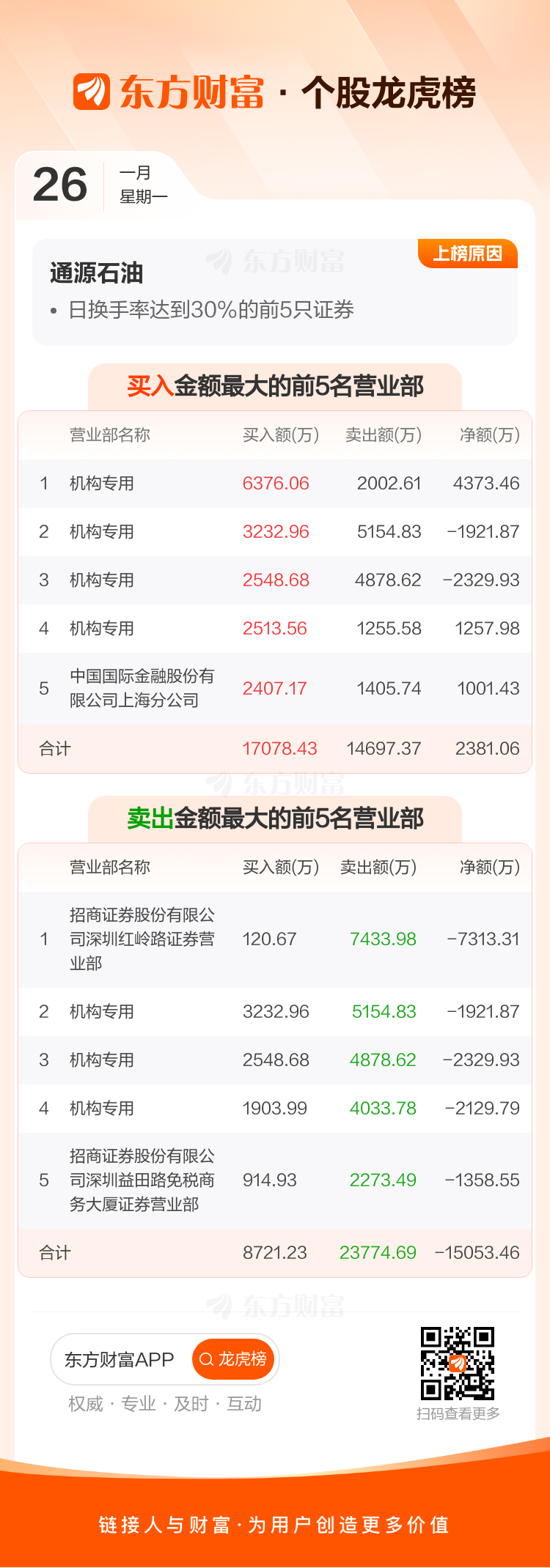 交易所2026年1月26日公布的交易公开信息显示,通源石油因成为日换手率达到30%的前5只证券上榜。通源石油当日收报8.93元,涨跌幅13.04%,偏离值38.87%,换手率38.87%,成交额19.58亿。