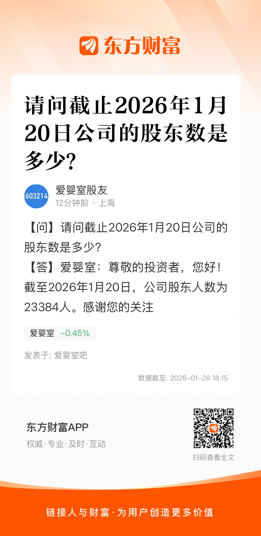 尊敬的投资者,您好!截至2026年1月20日,公司股东人数为23384人。感谢您的关注