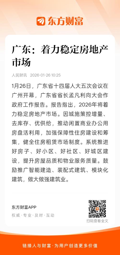 1月26日,广东省十四届人大五次会议在广州开幕,广东省省长孟凡利向大会作政府工作报告。报告指出,2026年将着力稳定房地产市场。因城施策控增量、去库存、优供给,推动闲置商业办公用房盘活利用,加强保障性住房建设和筹集,健全住房租赁市场制度。系统推进好房子、好小区、好社区、好城区建设,提升房屋品质和物业服务质量。鼓励推广智能建造、装配式建筑、模块化建筑,做大做强建筑业。
