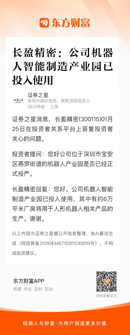长盈精密回复:您好。公司机器人智能制造产业园已投入使用,其中有约6万平米厂房将用于人形机器人相关产品的生产。谢谢。