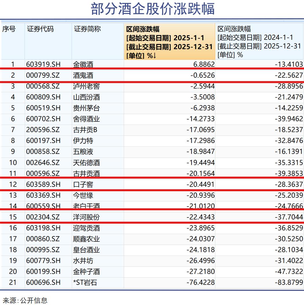 如口子窖这种典型的腰部酒企、地方性酒企,2025年业绩预告预计归母净利润仅为6.62亿元至8.28亿元,同比大幅下滑50%至60%,创下近年来最大业绩跌幅——但这个跌幅仍然比洋河股份小。